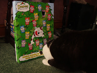 Our cat Gus love the cat treat Dreamies, shake the packet and he goes like a rocket! Have you seen the advert on TV, yes that does it to him. He has radar ears even when you only pick the packet up.......anyway shopping in Asda we found a Dreamies advent calendar so we just had to buy Gus one. Well yesterday he had door No 1 contents which he gobbled up in record time and the look on his face when they had gone. Today I took pictures of him with door No 2 and here they are.......................the kids reckon the cat is spoilt.